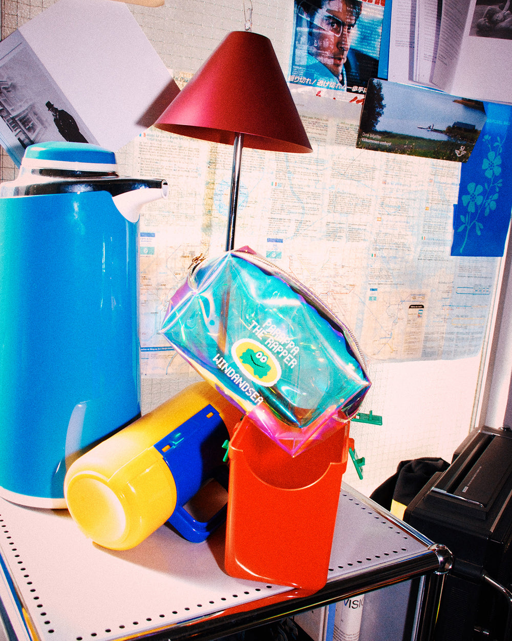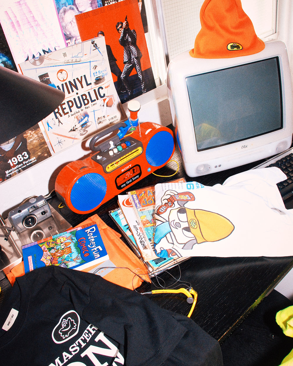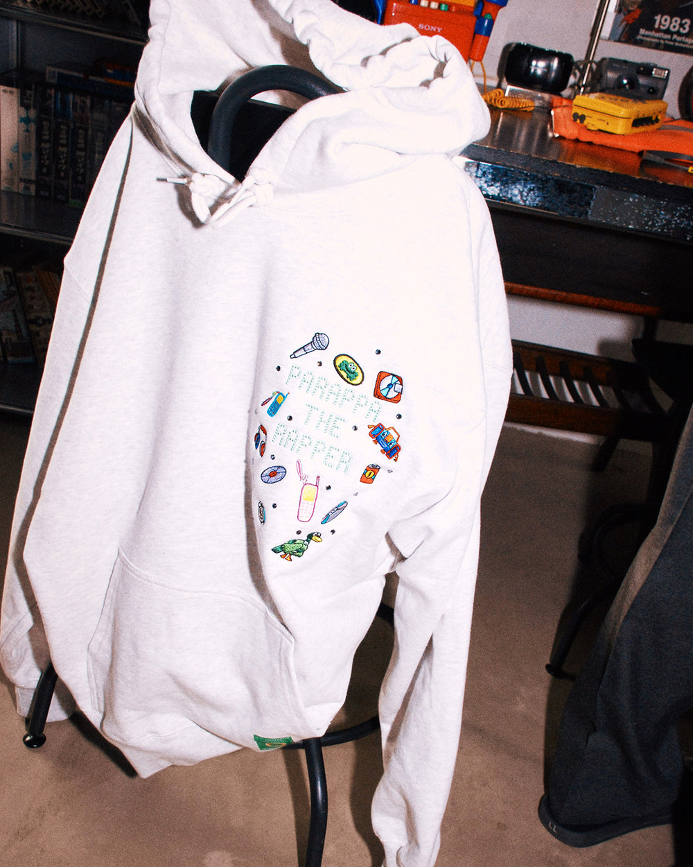 30周年を迎える『パラッパラッパー』のために、ロドニー・グリーンブラット氏が本企画のために描き下ろしたアートワークをメインビジュアルに採用。90年代から2000年代の平成カルチャーを現代的に再解釈した、ノスタルジーとフューチャリスティックな感性が融合するコレクションとなっています。ガラケーやクリアカラーのパレット、ファー素材といった当時を象徴するモチーフをアイテムに落とし込み、海外版PlayStationパッケージから着想を得たウェアデザインを展開。さらに、タマネギ先生をイメージした黒帯ベルト、スクールバッグ、オーロラ仕様のクリアポーチ、オリジナルで制作されたぬいぐるみキーホルダーやぷくぷくシールなど、パラッパラッパーファン垂涎の多彩なラインナップを揃えています。
