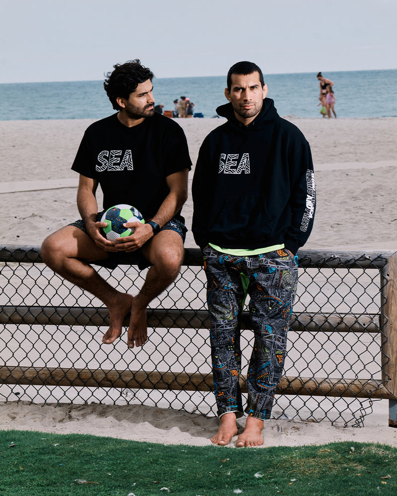 The collaboration collection with Albino & Preto, the martial arts uniform and lifestyle brand, fuses combat-ready gi and no-gi essentials with streetwear inspired by surf culture. Featuring a bold California beach camo print, the pieces are designed to stand out both on the mat and off it. In addition to casual staples like graphic tees and hoodies, the lineup includes a playful custom-designed soccer ball that adds a touch of fun and creativity.