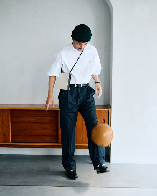 シルエットは全体的にワイドながら、裾に向かってわずかにテーパードさせ、洗練されたラインを実現しています。さらに、裾や袖にはシングルステッチを採用し、クラシックな印象をさりげなくプラス。