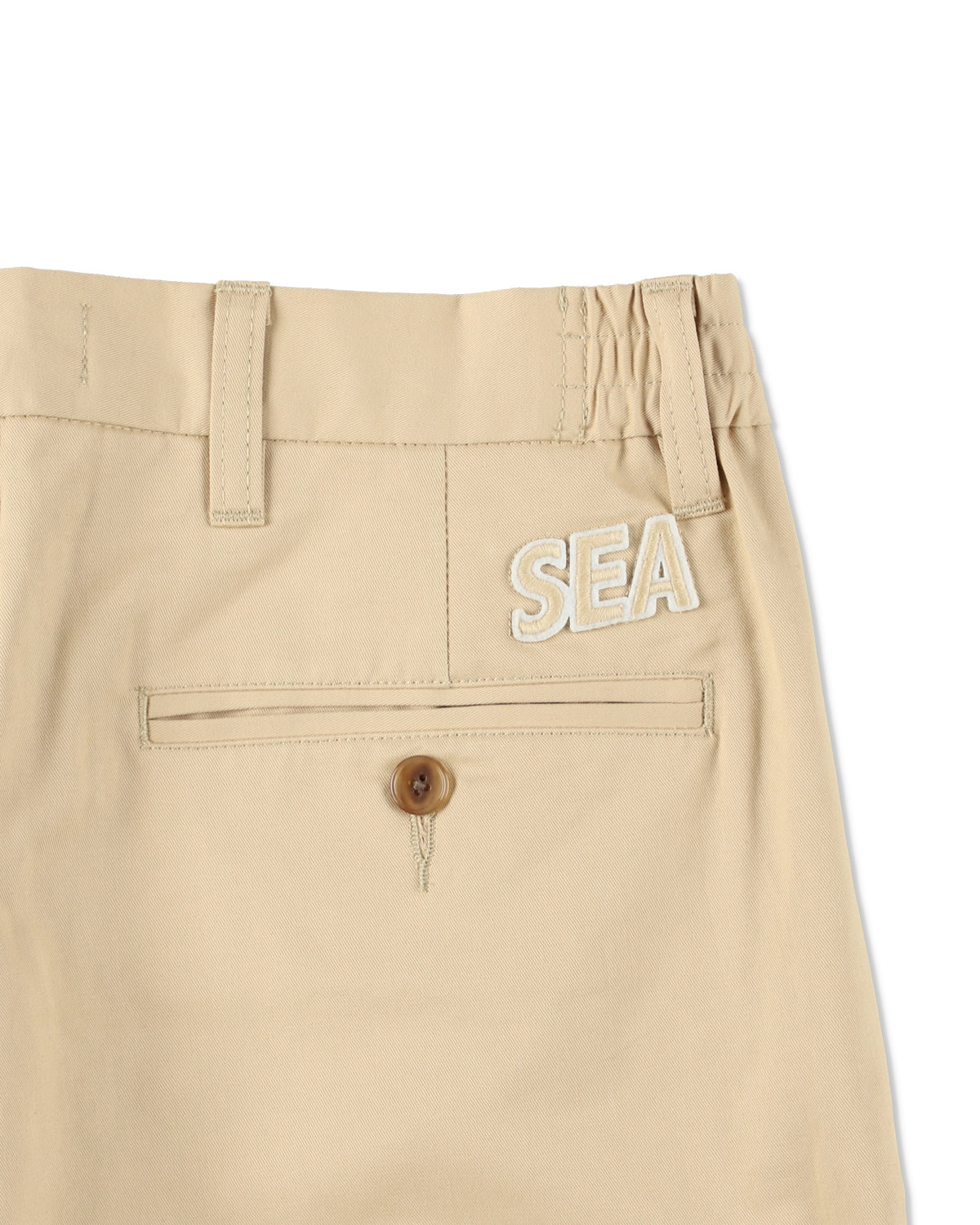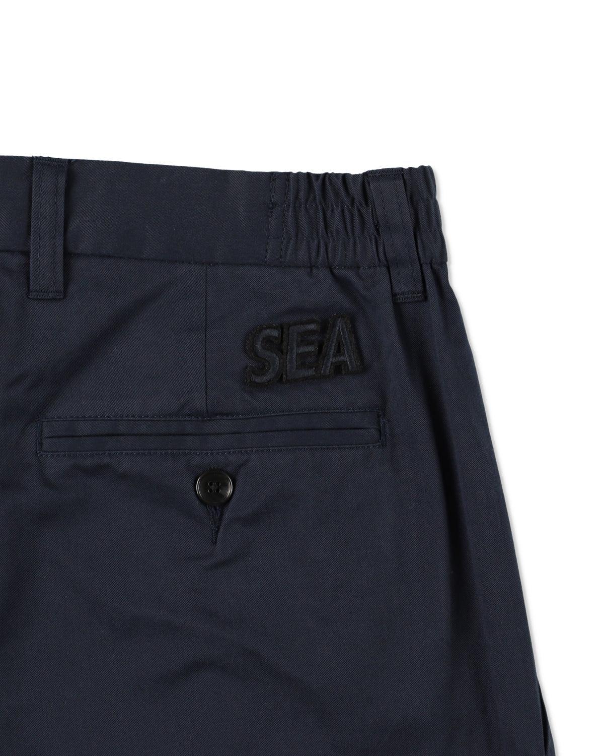An elastic insert at the sides of the waist provides a comfortable, adaptive fit. The thighs are cut generously, while front tucks create a slimmer, refined silhouette that’s easy to wear. Crafted from durable chino fabric with a smooth hand feel and a subtle yet structured drape, these pants balance casual versatility with a touch of sophistication—perfect for both everyday wear and more polished styling. The front is accented with a bold “SEA” logo patch made from felt and finished with intricate embroidery, adding a striking, three-dimensional detail.