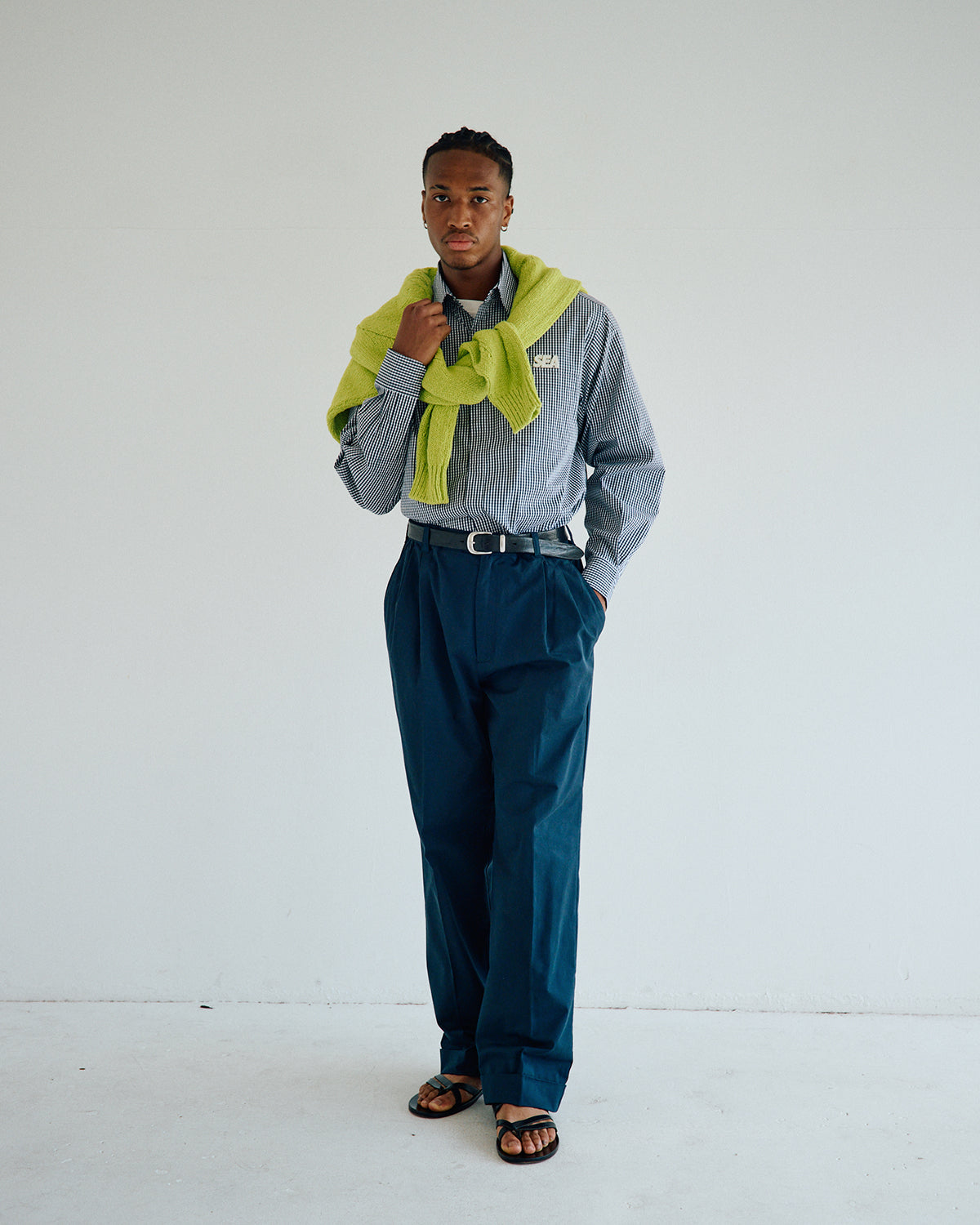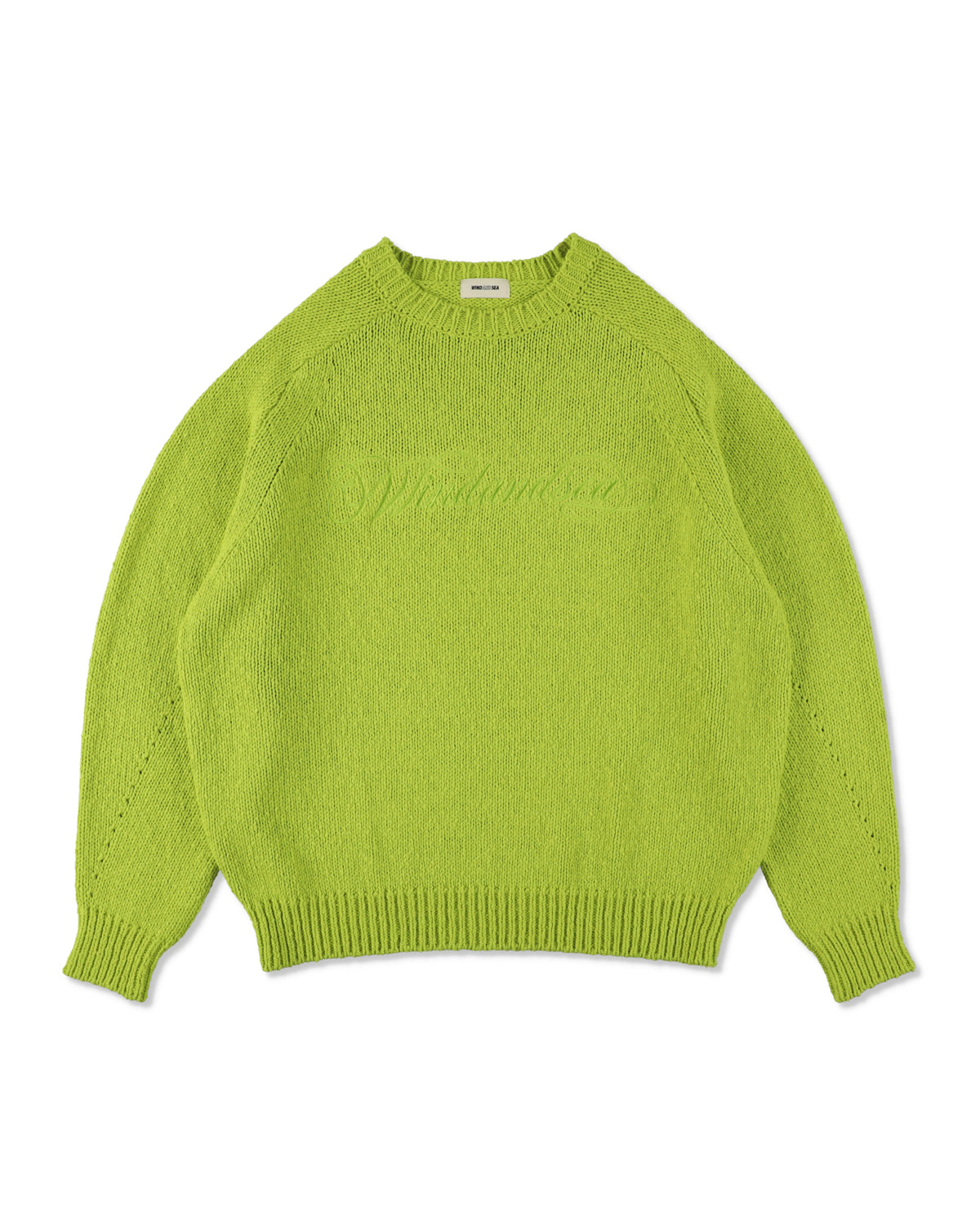 太さにムラのあるスラブ糸を使用し、糸そのものの凹凸感が編地に豊かな表情を与えるニット。フロントにはカリグラフィー調のロゴを刺繍で施し、素材感と静かな存在感を引き立てています。