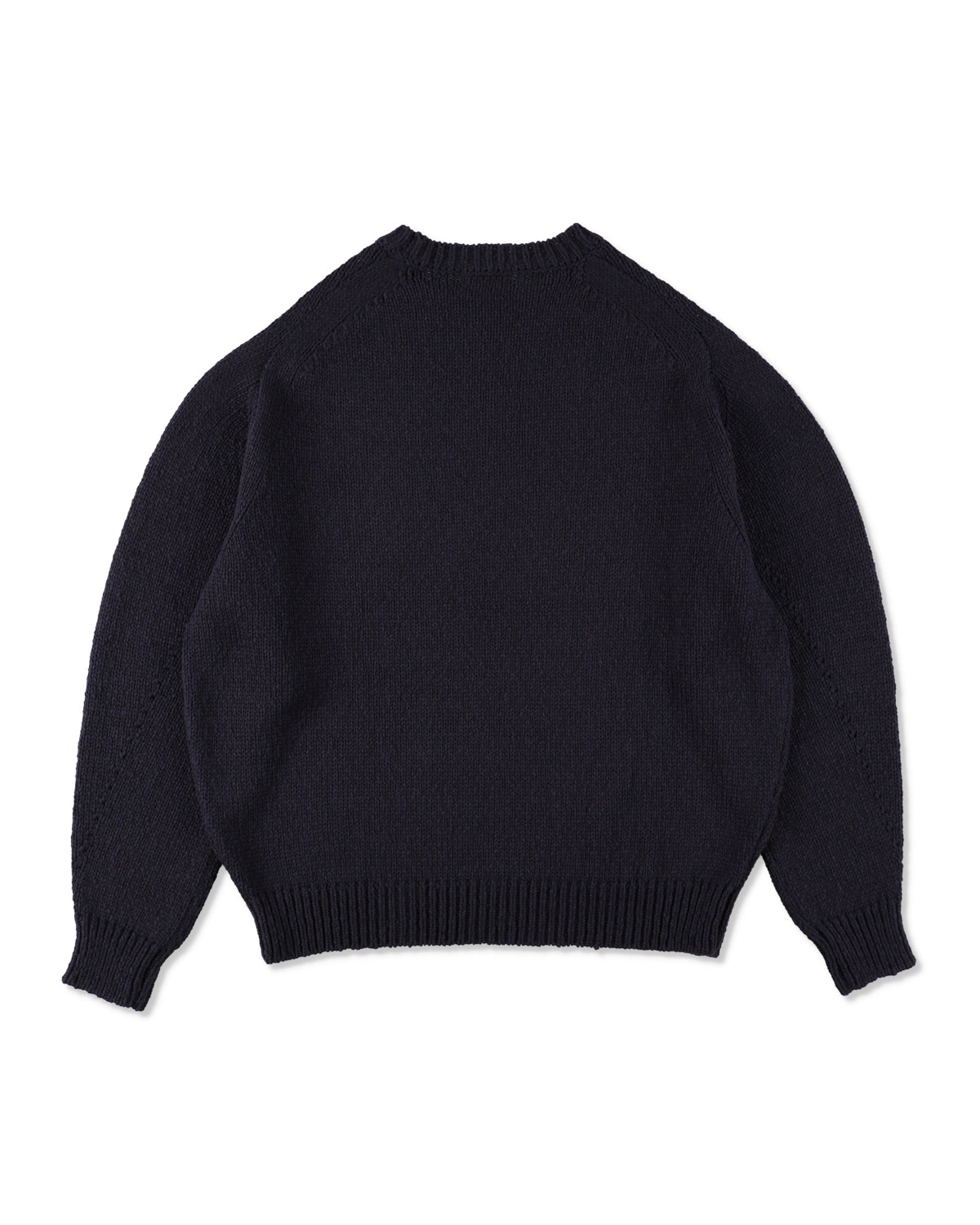 A knit crafted from slub yarn with irregular thickness, creating a rich, textured surface through the natural unevenness of the yarn. A calligraphy-style logo is embroidered on the front, adding a subtle yet distinctive accent.