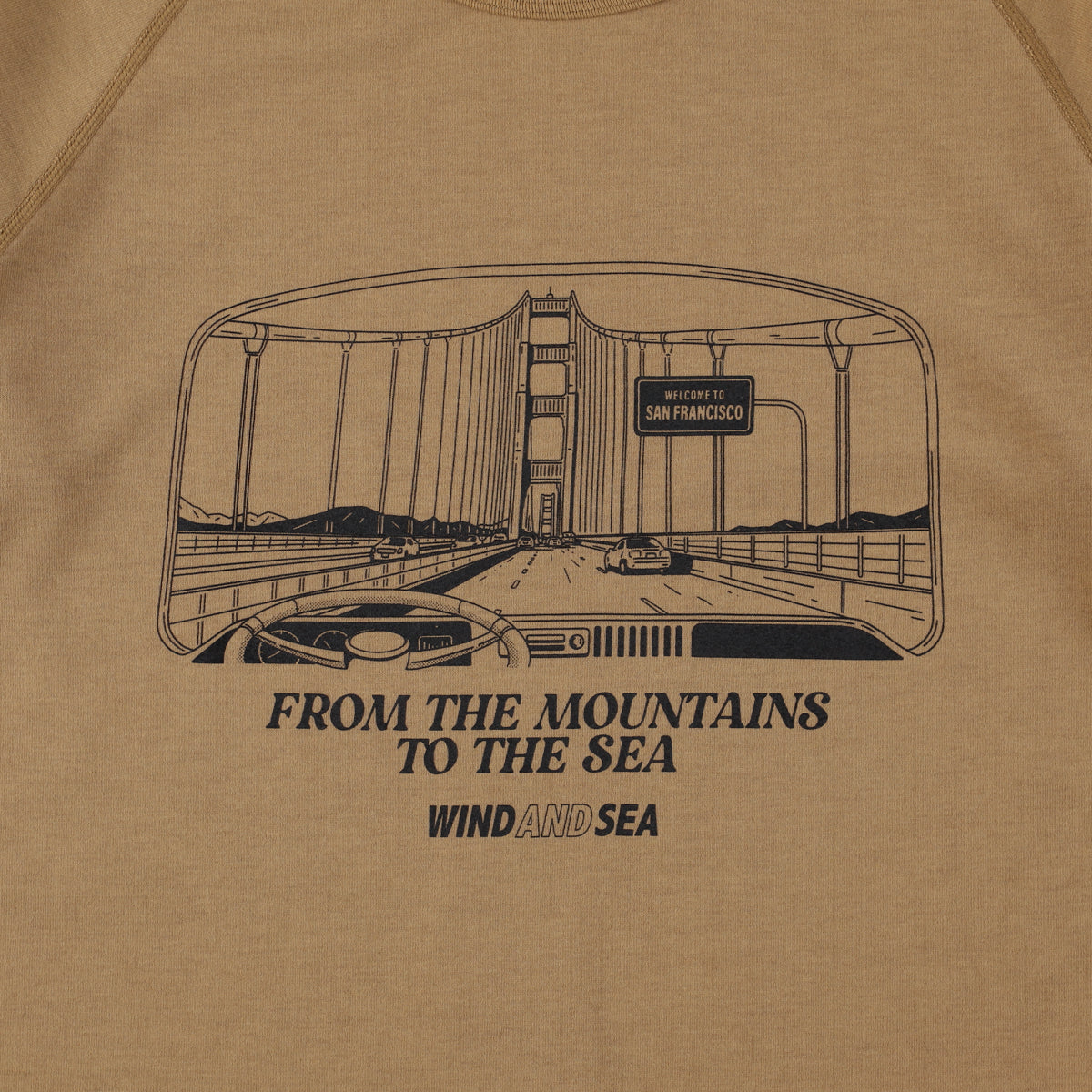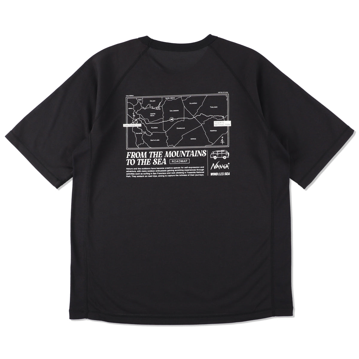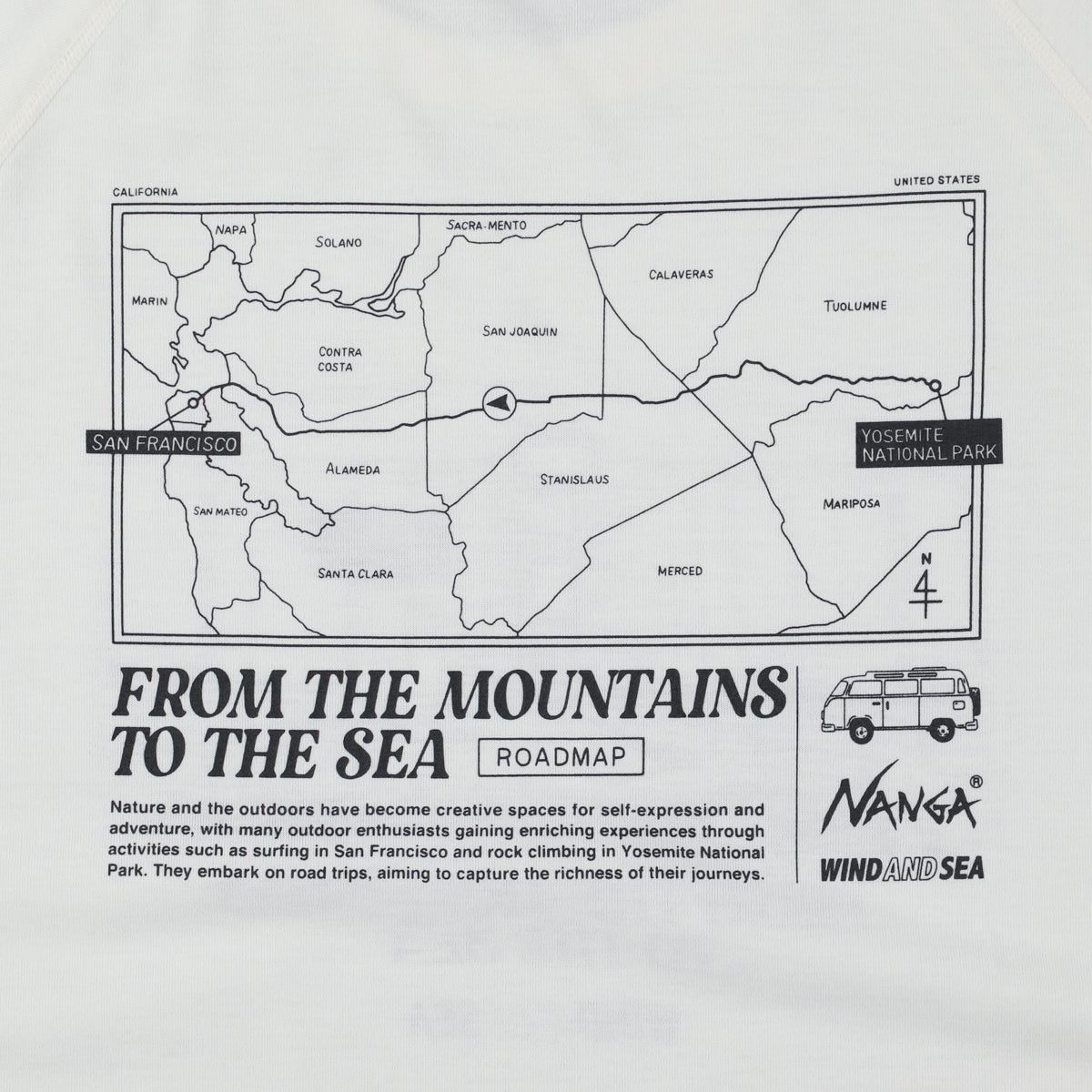 グラフィックコンセプト「MOUNTAIN TO SEA (山から海へ)」「SEA TO MOUNTAIN(海から山へ)」という内容です。NANGAは山、 WIND AND SEAは海。というそれぞれの出自をベースにオリジナルグラフィックをデザインしました。これをベースに「From Yosemite to San Francisco」というロードマップをテーマにし、ヨセミテの風景、サンフランシスコのベイエリアなど海を感じる街並みをイラストで表現しています。