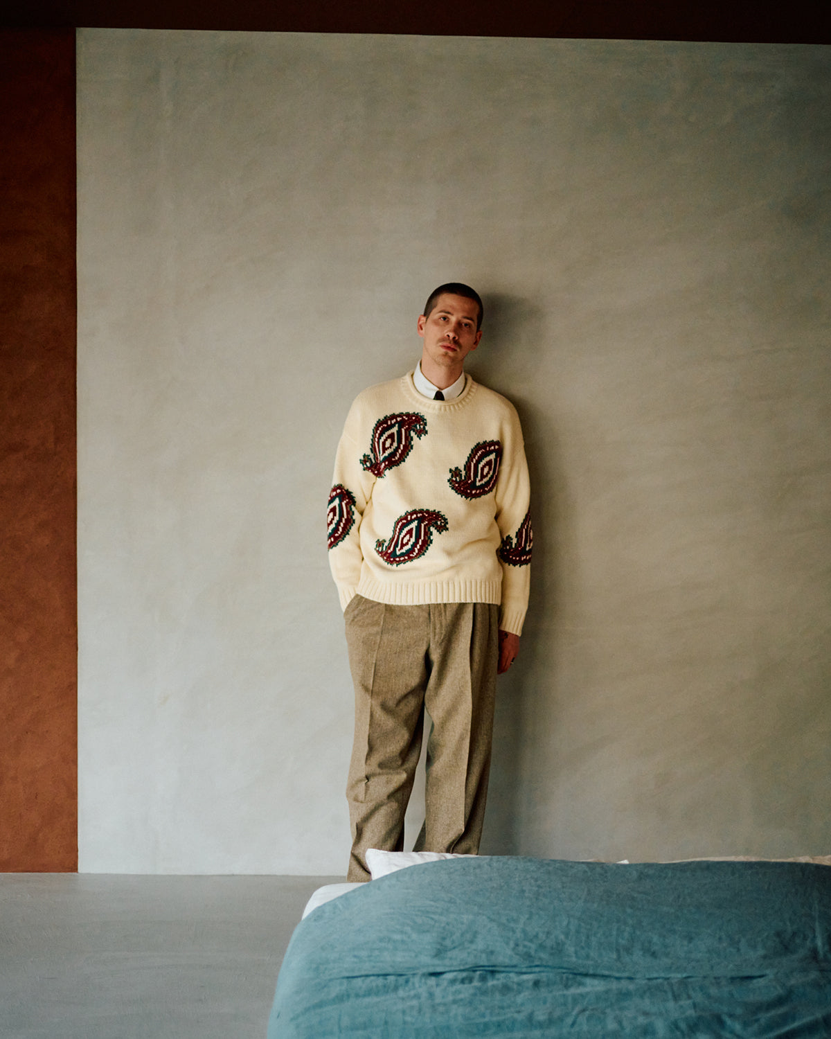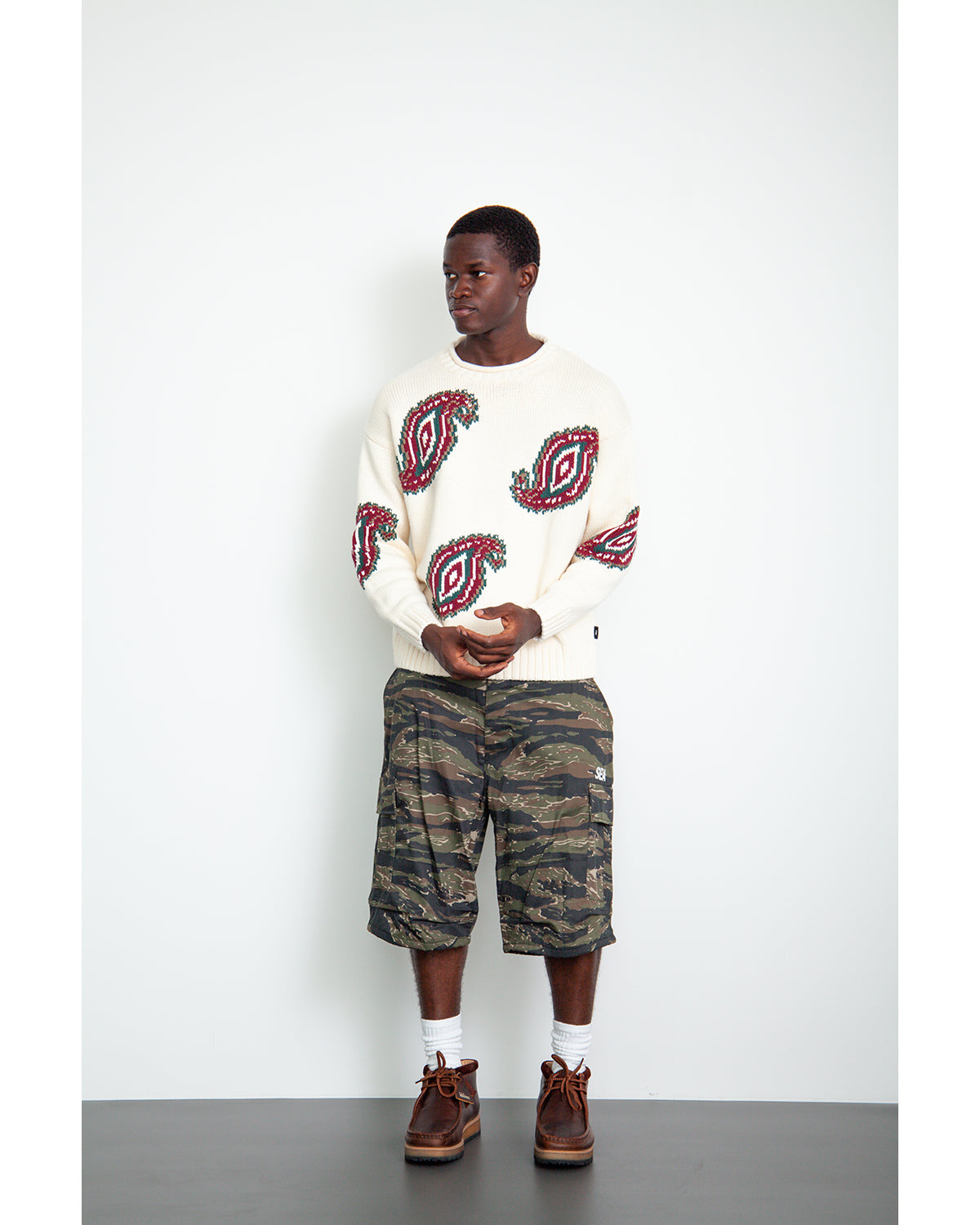 A jacquard knit featuring a paisley motif inspired by the letter “S.”