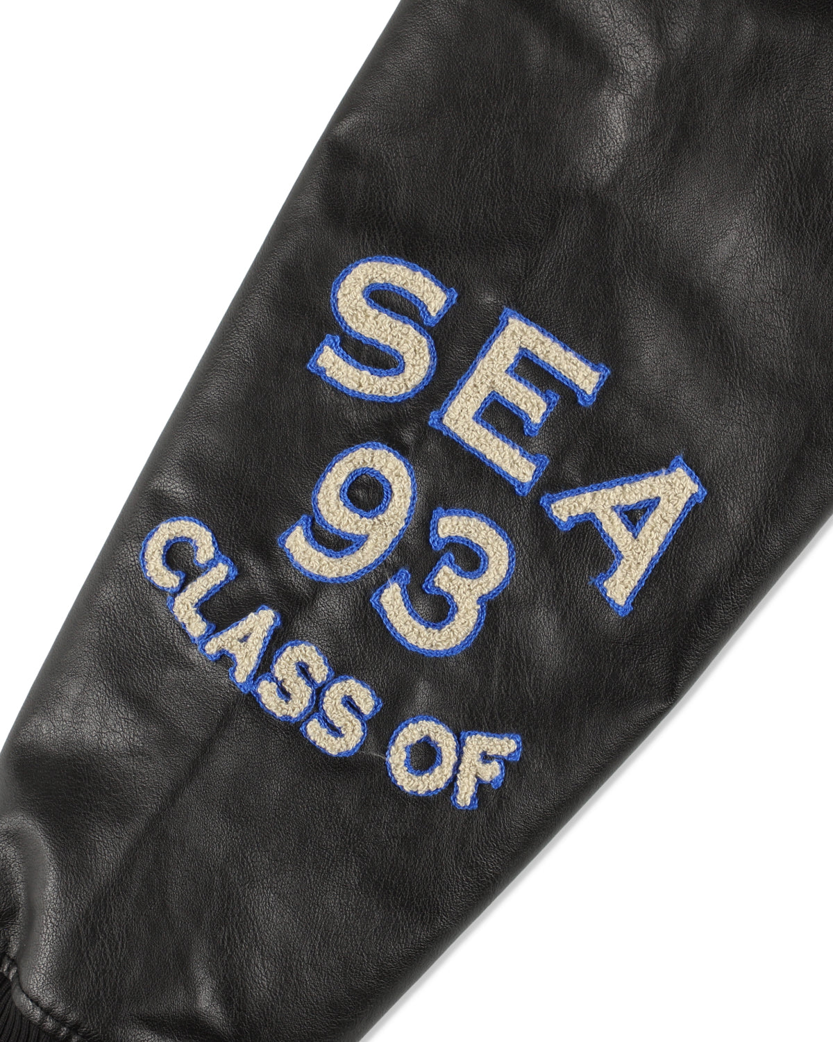The sleeves are crafted from eco-friendly synthetic leather, while chenille embroidery highlights the unforgettable moments of 1993.